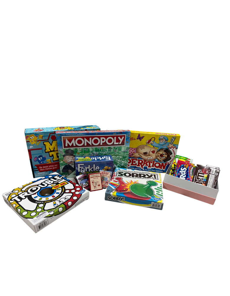 Enjoy a game night with Operation, Farkle, Trouble, Monopoly, Mouse Trap, Sorry, Old Elf, Crazy Eights and lots of candy to keep the night going.