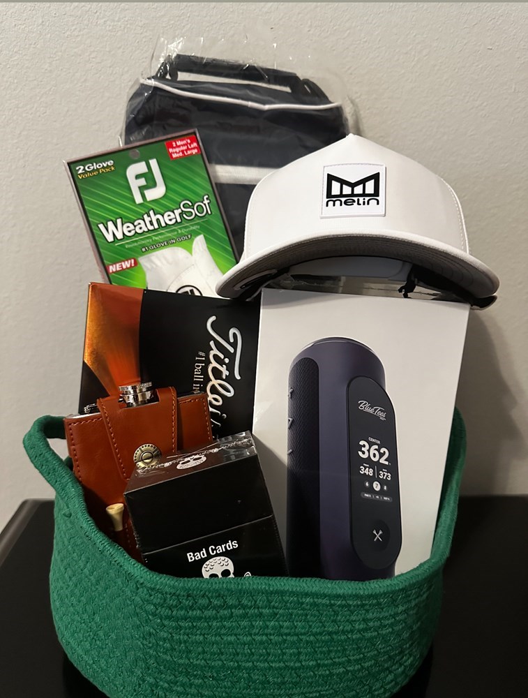 Golf Package: -Footjoy Men’s 2 pack golf gloves (white) -Box Titleist Pro V1 golf balls, -Melin Odyssey Stacked Hydro Snapback Hat (white), -Blue Tees Golf Player w/GPS, speaker w/ touchscreen display, 40000 courses w/visual, audible distance, hazards - Bad Cards for Good Golfers game - Golf cooler bag insulated w/ice packs - Golf Flask gift set with leather case (includes divot tool, tees and ball marker $445)