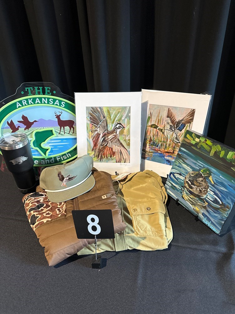 Donated by Nell Koopman. Mailing a box of “duck” themed stuff for auction. Total value about $375-$400. Speaker Yeti cup $75. Neon Arkansas Game and Fish sign $200.