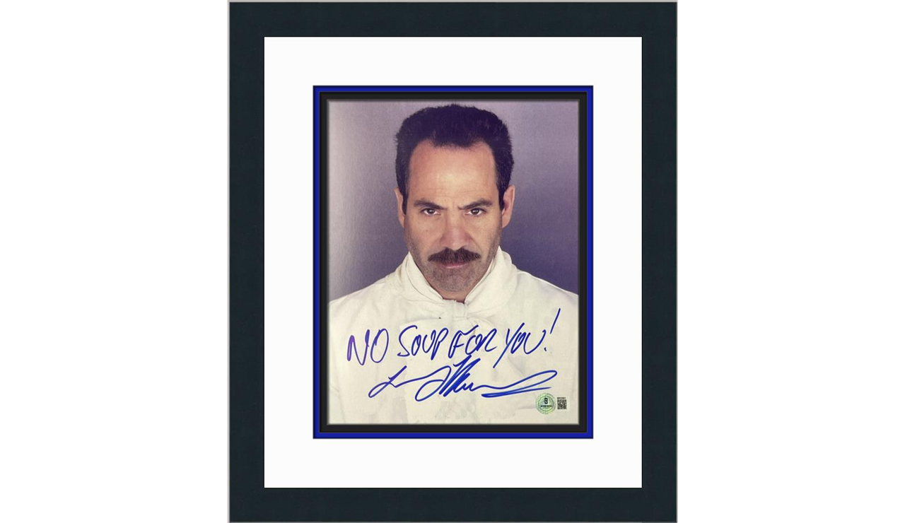 No soup for you! But you can win signed photo of Larry Thomas, the iconic actor known for his unforgettable portrayal of the "Soup Nazi" from Seinfeld. A must-have for fans, this autographed piece captures a legendary moment in television history! INCLUDES: - Color 8" x 10" photo signed by actor Larry Thomas best known for his role as The Soup Nazi from the iconic tv series Seinfeld. Larry has added the inscription “No Soup For You!!” - Photo is authenticated by Beckett Authentication - Framed size: 14" x 16" - FREE shipping within the continental United States Long Island Silent Auction is the tri-state area’s premier silent auction company. With over 30 years of experience in sports memorabilia and framing, Long Island Silent Auction offers only the highest quality authentic items. All items are sourced directly through the athletes or their representatives and come authenticated by leading 3rd party authenticators. All frames are museum quality. Our number 1 priority is your satisfaction. Details: "Soup Nazi" Signed and Framed Photo, Restrictions: Winner will receive item exactly as pictured. Signature placement and ink color may vary. Book within 9 months of purchase. Valid: Valid for shipments within the continental US