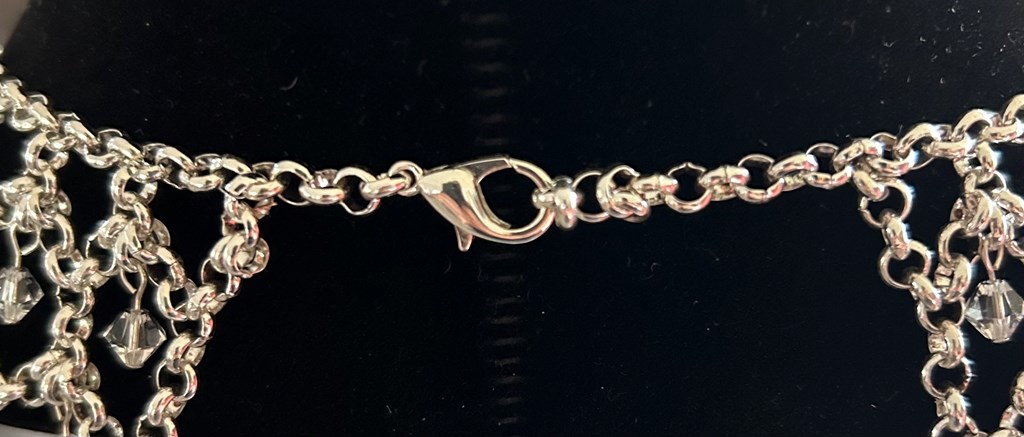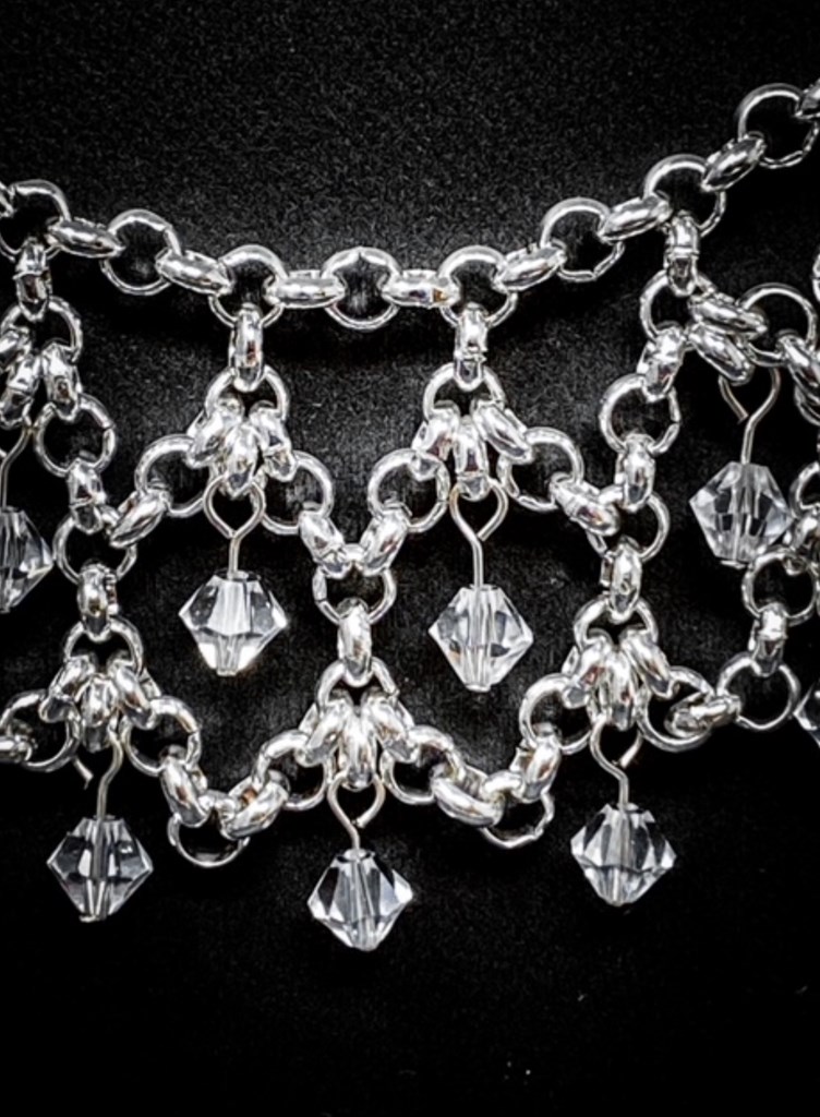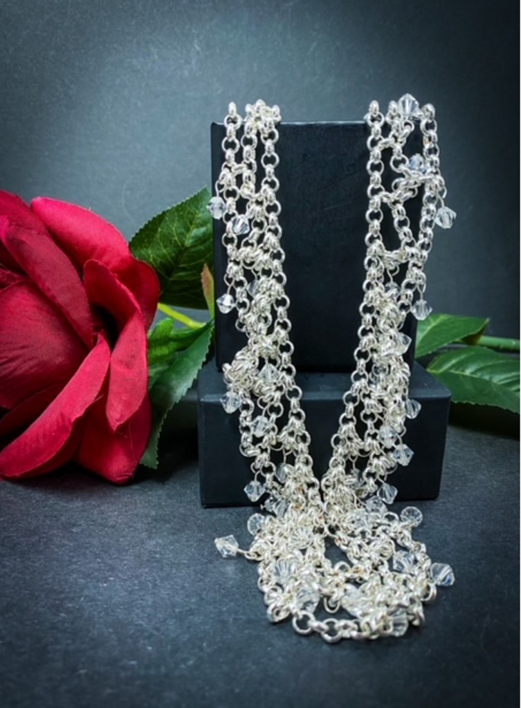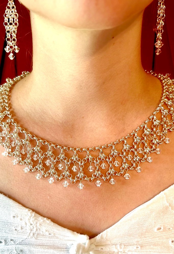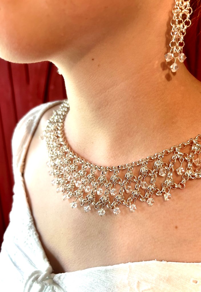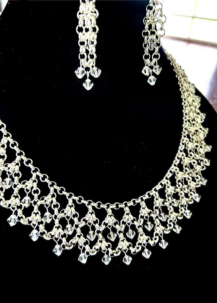 Beautiful and elegant fairytale silver layered gunmetal chainmail necklace and earrings Details: • Gunmetal-plated steel • Silver-plated steel • Clear bicone crystals • Lobster claw clasp • Built-in extension chain • 20 inches