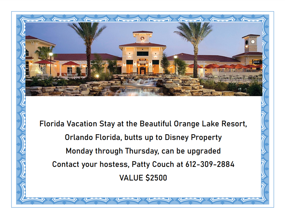 Escape to sunny Orlando with a 5-night stay in a spacious 2-bedroom suite at Orange Lake Resort — just steps from Disney World®! Perfect for a family getaway, this resort offers 4 outdoor pools including a lazy river, 3 arcades, sports courts, four golf courses, mini golf, watersports rentals, and 7 dining options. With room for up to 8 guests, this vacation is a fun-filled retreat everyone will love. Bid now to create unforgettable family memories in Orlando! Details: Valued at $2500 (Does not include airfare) Orange Lake Resort in Florida – abuts up to Disney property (Disney entrance is not far away) The trip is for 5 nights (including weekends) It is a 2 bedroom suite that sleeps a total of 8 The donor’s name is Patty Couch, she wants to be contacted by the winner, as soon as possible, to book the trip and give them any info they may need. PENDING AVAILABILITY This trip can be upgraded, Patty can explain that to them when they call her 612-309-2884 Does not include park access.