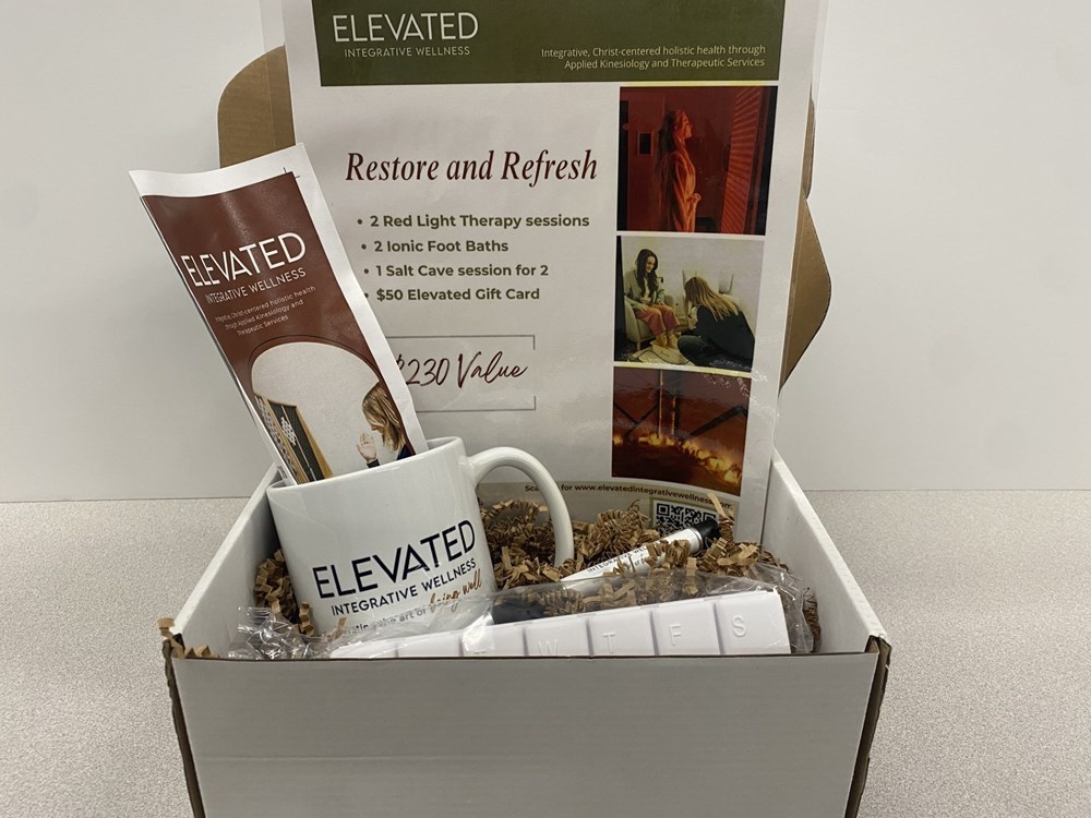 Relax, restore, and rejuvenate with this holistic, integrative, Christ-centered wellness package from Elevated Integrative Wellness. Perfect for anyone seeking balance and renewal for body, mind, and spirit. Package Includes: - 2 Red Light Therapy Sessions – Support healing and cellular renewal - 2 Ionic Foot Baths – Gentle detox and relaxation - 1 Salt Cave Session for 2 – Breathe deeply, reduce stress, and refresh your system - $50 Elevated Gift Card – Choose additional services or products to enhance your wellness journey Bid now to treat yourself (or a loved one) to the gift of rest, renewal, and holistic care!