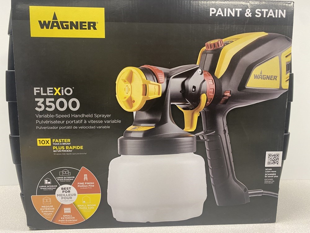 Upgrade your next painting project with the Wagner FLEXiO 3500, designed for speed, precision, and ease: - 10X Faster than a Brush – Get a smooth, consistent finish on walls, fences, decks, cabinets, furniture, and more - X-Boost Turbine Power – Spray unthinned paints, primers, stains, and sealers directly from the can - Customizable Settings – Adjustable flow, spray width, pattern, and variable speed for ultimate control - 2 Nozzles Included – iSpray nozzle for large surfaces + Detail Finish nozzle for fine projects - Easy Cleanup & Storage – Quick-rinse parts, disposable cup liners, and a durable storage case Bid now to tackle projects big and small with professional-quality results at home!