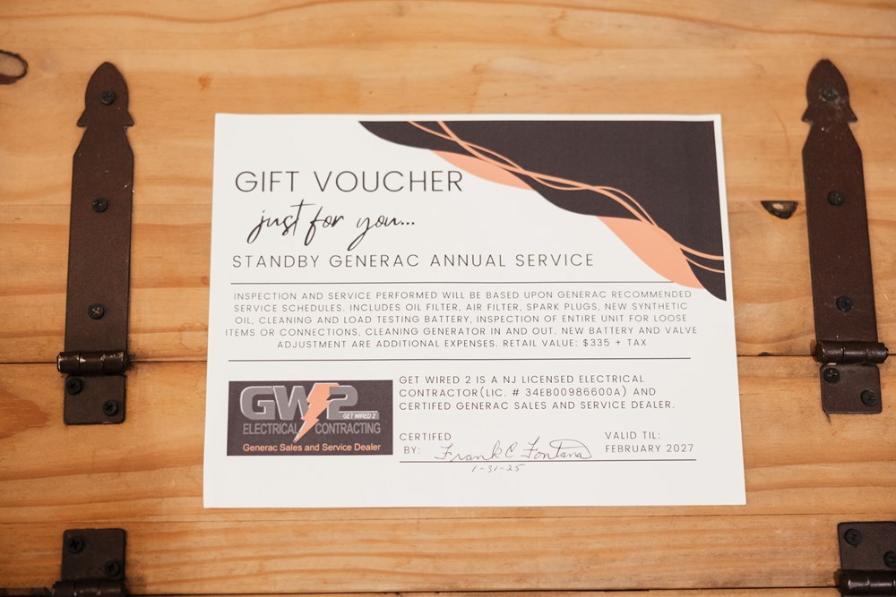 Keep your home running smoothly with a $335 professional Generac generator service gift certificate from Get Wired 2. Expert technicians will ensure your standby generator is in top condition, ready to deliver reliable power when you need it most. Regular service means protection, performance, and peace of mind during any outage. Perfect for homeowners who want to protect their families and keep the lights on, no matter the weather.