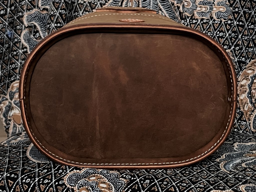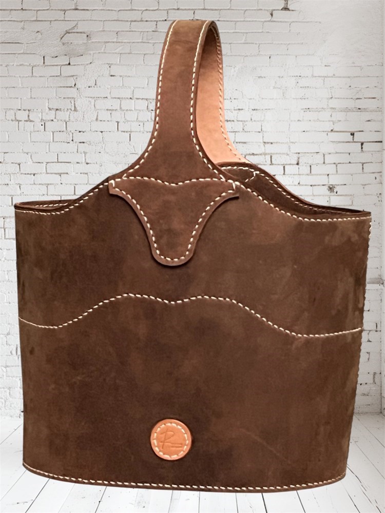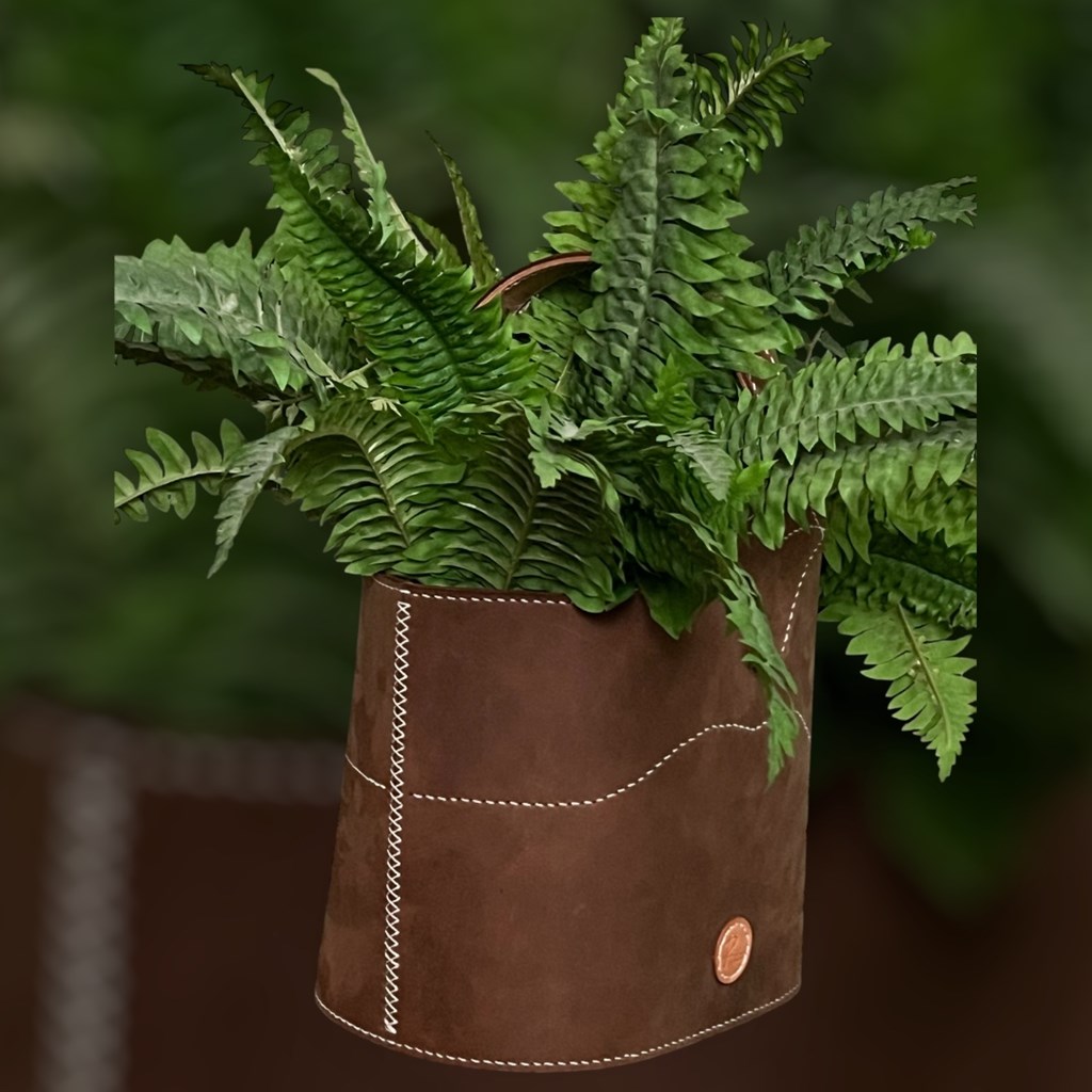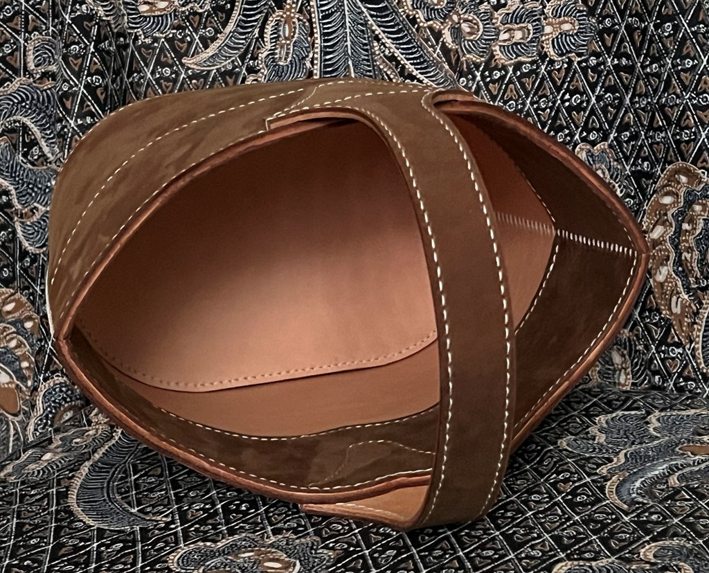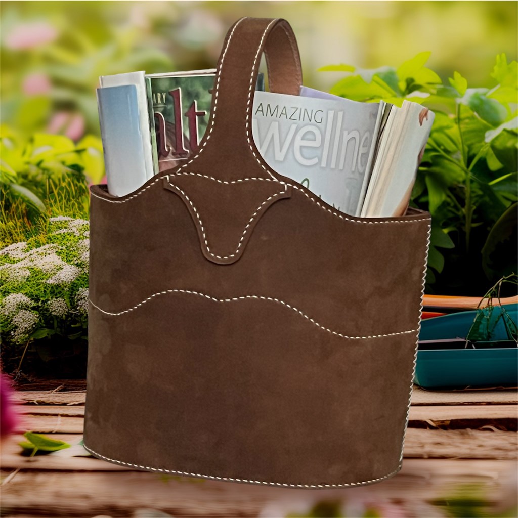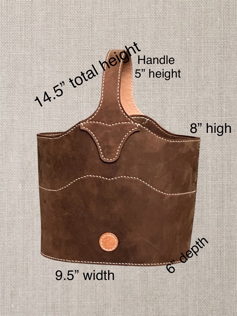 Bid on a one-of-a-kind piece of craftsmanship that brings timeless style and everyday function into your home. Leather Storage Container – Handcrafted with Precision This premium leather storage container is a perfect blend of craftsmanship and functionality. Entirely hand-stitched with care and precision, it showcases the dedication of traditional leatherworking. No machines involved—just skilled hands and attention to detail. Crafted from a combination of durable chrome-tanned leather and character-rich vegetable-tanned leather, it offers both strength and timeless style. The chrome leather provides flexibility and resistance to wear, while the veg-tan leather develops a beautiful patina over time, giving each piece a unique character. Versatile by design, this container is ideal for storing magazines, displaying floral decor, organizing tech gear, or even serving as a stylish catch-all for your desk or home. Whether for everyday use or as a statement piece, it adds a rugged elegance to any space. Features: 100% hand-stitched construction for lasting durability. Made from a mix of chrome-tanned and vegetable-tanned leather. Multi-purpose design for home or office use. Natural materials that age beautifully over time. A true testament to handmade quality and timeless utility. Dimensions: Height: 8”; Total height including handle: 14.5”; Handle: 5”; Width: 9.5”; Depth: 6”.
