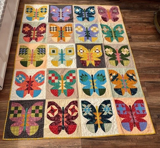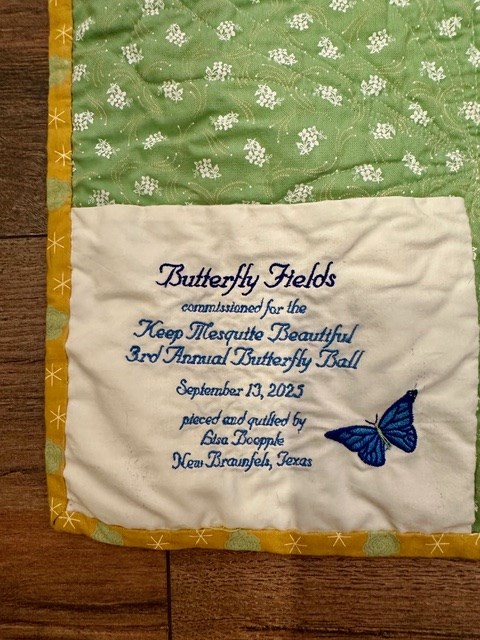 Value: Priceless Bid on a one-of-a-kind, handcrafted quilt created exclusively for the Keep Mesquite Beautiful Butterfly Ball. Description: Butterfly Fields was commissioned for the Keep Mesquite Beautiful 3rd Annual Butterfly Ball on September 13, 2025 (before the date change to the 20th). This donation was pieced and quilted by Lisa Boepple of New Braunfels, Texas. Each butterfly block showcases colorful artistry and craftsmanship, making it both a functional piece and a lasting keepsake. Features: Handcrafted design. Commissioned specifically for the Butterfly Ball. Artist: Lisa Boepple, New Braunfels, Texas. Dimensions: 60” x 75”