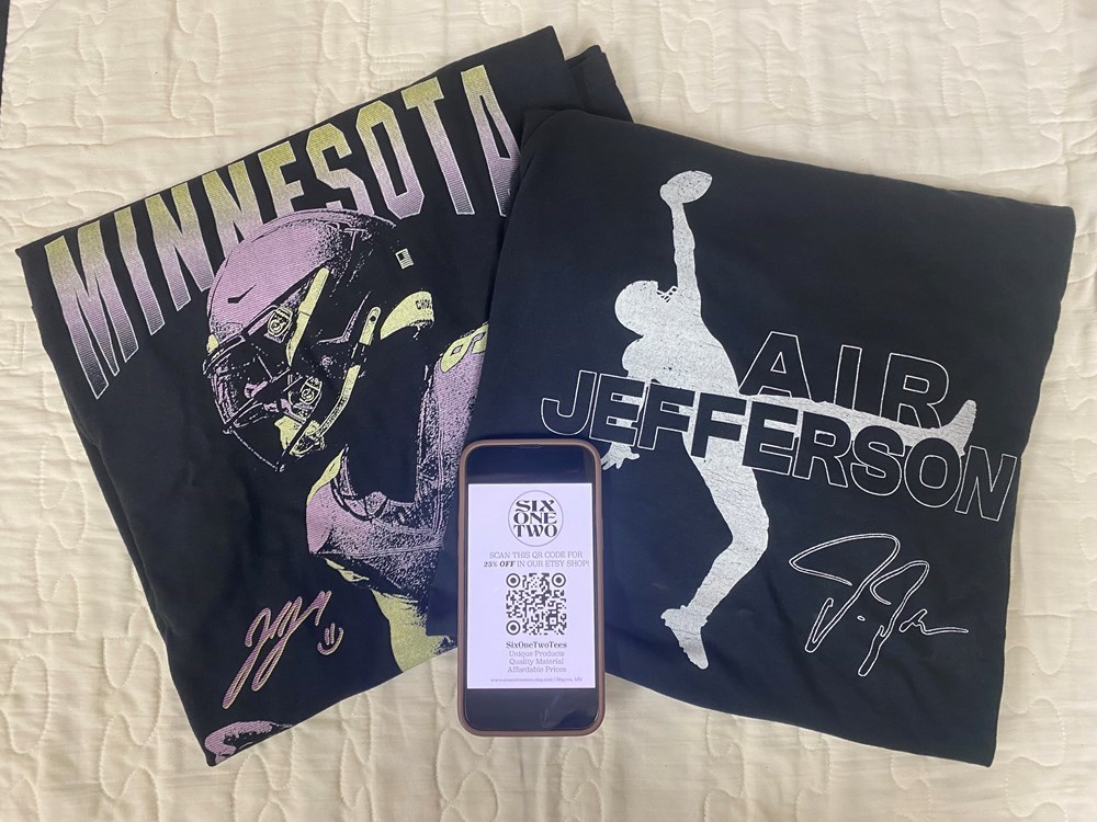 2 Locally Made custom T-Shirts from SixOneTwoTees Vintage JJ McCarthy Vikings T-Shirt: Game Day Tee, Purple & Gold Size XL Justin Jefferson Vintage T-Shirt: Minnesota Vikings Game Day Tee SIze XL