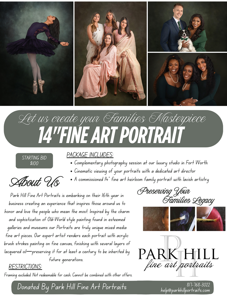 Commission a timeless 14" fine art portrait—an heirloom-quality piece created exclusively by Park Hill Fine Art Portraits. Description: Park Hill Fine Art Portraits is honored to donate a commissioned 14" fine art portrait, crafted with the studio’s signature artistry and attention to detail. Known for capturing meaningful connections, Park Hill creates heirloom pieces that honor and celebrate the people who mean the most in your life. Features: 14" commissioned fine art portrait. Personalized session and portrait experience. Crafted with heirloom quality for generations to enjoy. Dimensions: 14" fine art portrait. Donor: Park Hill Fine Art Portraits – “Our mission is to create an experience that inspires those around us to honor and love the people who mean the most.” Terms & Conditions: Gift certificate valid for auction winner only. Non-transferable and not eligible for raffles or giveaways. Auction winner will receive the printed certificate and accompanying brochure at the event.