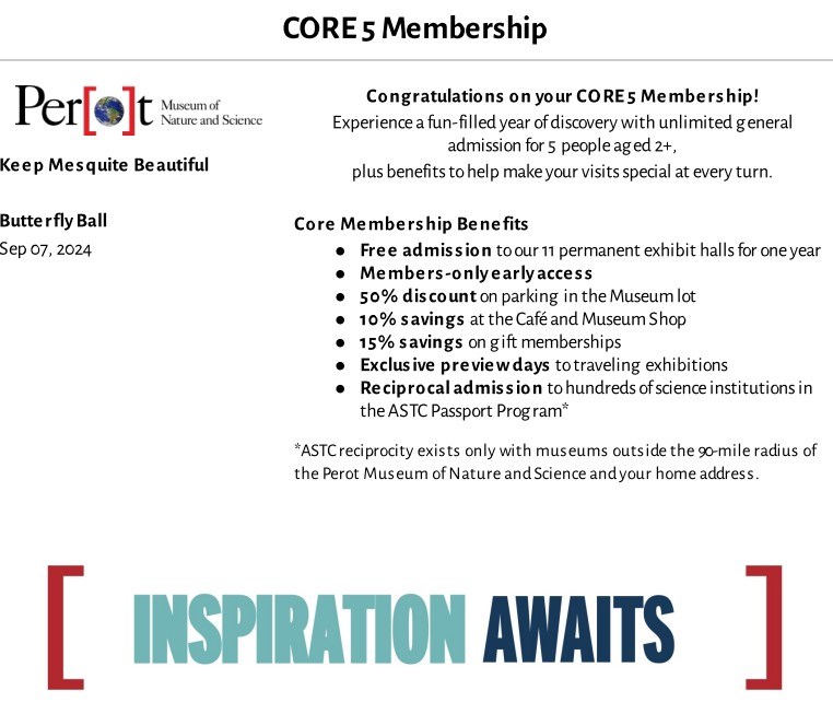 FMV: $165 | We are grateful for the continued support of the Perot Museum of Nature & Science, a valued repeat donor. Science and nature enthusiasts won’t want to miss this Core 5 Membership, offering a full year of discovery and adventure for up to 5 people. Membership includes unlimited general admission for 5 (ages 2+), along with member benefits that make every visit special: Features: Unlimited access for one year to 11 permanent exhibit halls Early members-only hours 50% off museum parking 10% discount in the café and museum shop Exclusive preview days for traveling exhibitions Passport Program: free reciprocal admission to hundreds of museums and science centers through the ASTC Travel Passport Program