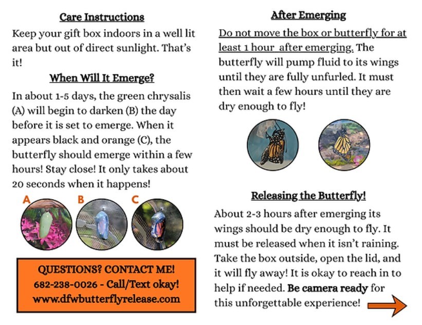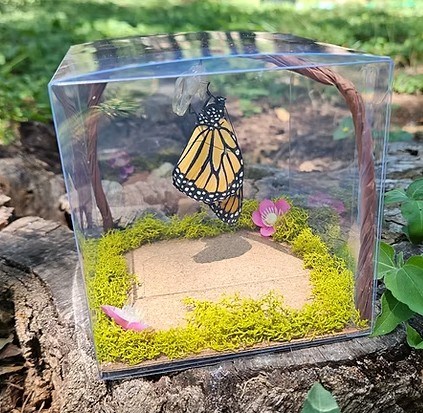 Witness nature’s wonder up close. This Live Monarch Butterfly Pupa Gift Box offers the rare chance to watch a chrysalis transform into a butterfly within 1–4 days. Each chrysalis is carefully secured inside a 3" clear display box, handcrafted with ventilation and designed for safe viewing until the butterfly is ready to emerge. Whether celebrating life, honoring a loved one, or gifting a moment of beauty, this experience is both meaningful and unforgettable. Once your butterfly takes flight, it becomes a living symbol of hope and renewal—perfectly aligned with Keep Mesquite Beautiful’s mission of protecting pollinators and creating vibrant, sustainable spaces. Features: One live Monarch butterfly pupa (emerges in 1–4 days) 3" hand-curated clear display box with ventilation Easy care and release instructions (no feeding or cleaning required) Safe release once butterfly’s wings are dry