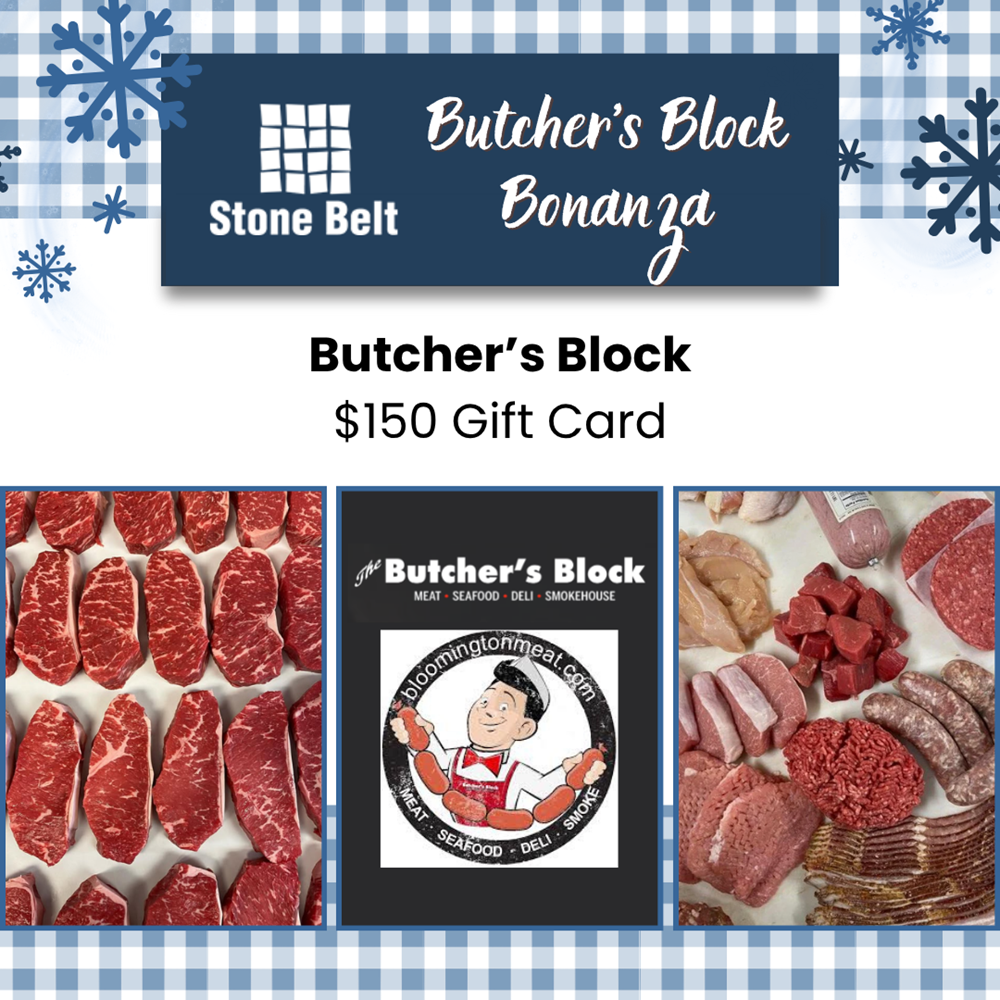 $150 Butcher's Block Gift Card Enjoy The Butcher Block's top-quality meats, fresh seafood, specialty cheeses, charcuterie meats, pantry goods, and many other culinary delights! The Butcher’s Block is a locally-owned custom butcher shop that staffs the highest skilled and most experienced butchers; and stocks the broadest, highest quality product mix in the area. www.bloomingtonmeat.com